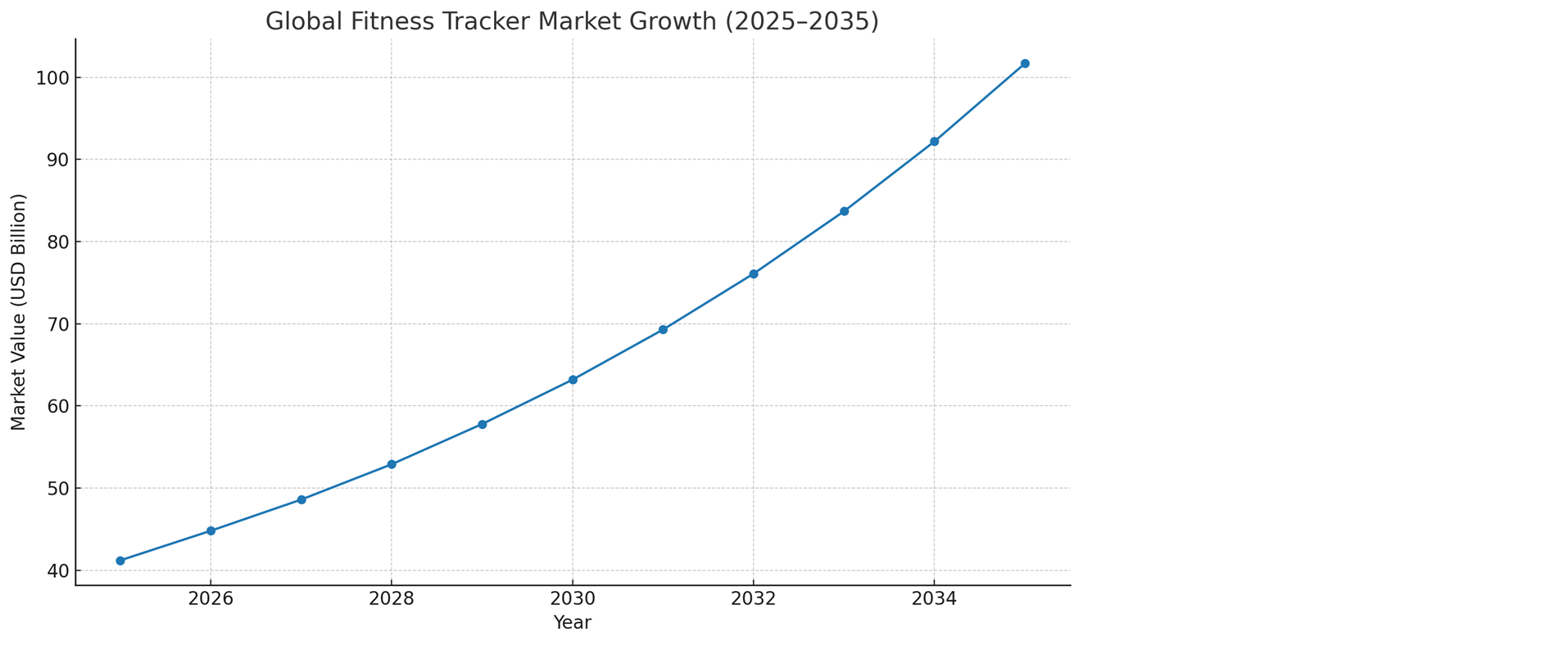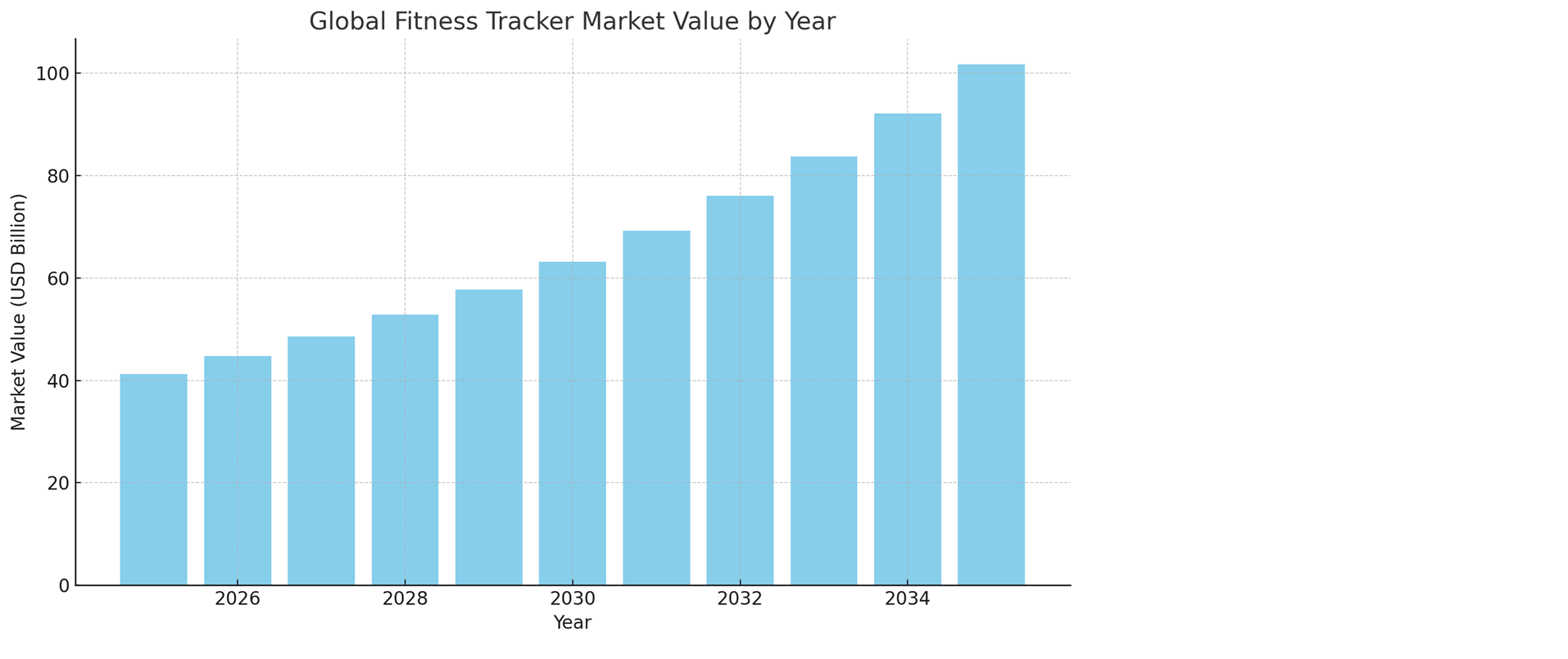 The global fitness tracker market is projected to grow at a compound annual growth rate (CAGR) of 16% from 2025 to 2035, reaching a market value of USD 323 billion by 2035. This growth is driven by increasing health consciousness, technological advancements, and the integration of fitness trackers with smartphones and other smart devices.