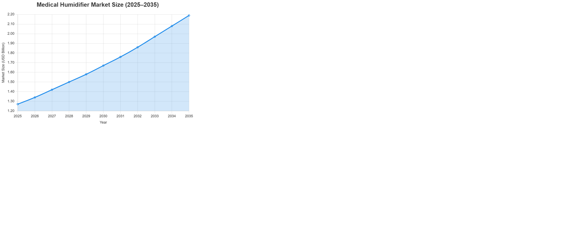 The medical humidifier market is projected to experience steady growth over the forecast period from 2025 to 2035, driven by a compound annual growth rate (CAGR) of 5.63%. The market is expected to expand from an estimated USD 1.27 billion in 2025 to USD 2.19 billion by 2035. This outlook is based on increasing demand for respiratory care devices, technological advancements, and the rising prevalence of chronic respiratory conditions. Medical humidifiers play a critical role in adding moisture to medical gases, preventing airway dryness, and enhancing patient comfort in applications such as mechanical ventilation, CPAP therapy, and anesthesia.