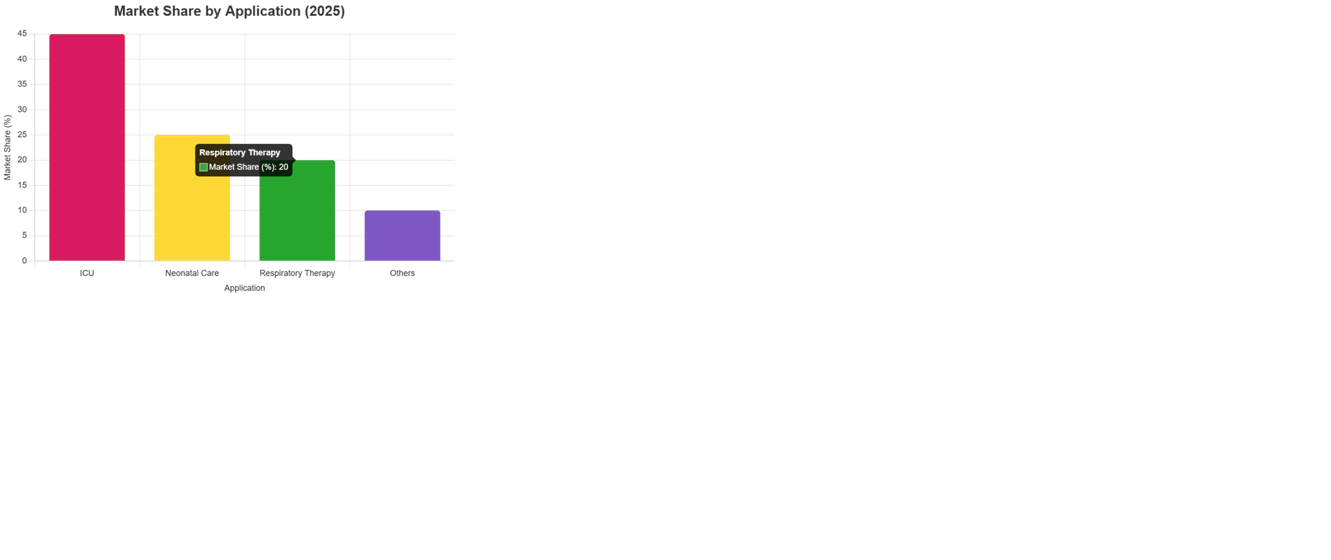 - Neonatal Care: 20-25%, highest growth rate due to rising preterm births and respiratory support needs.