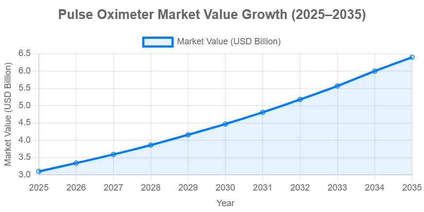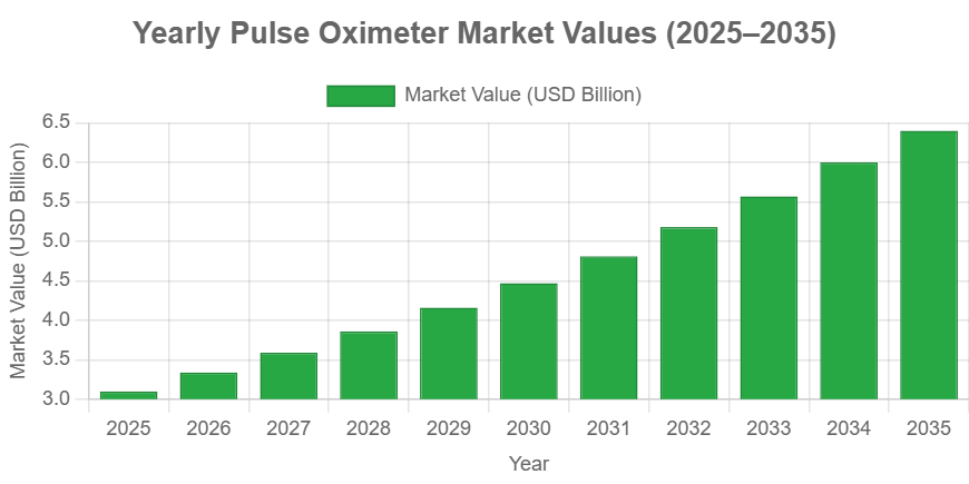 The global pulse oximeter market is projected to expand from USD 3.1 billion in 2025 to USD 6.4 billion by 2035, at a CAGR of 7.6%. This growth reflects increasing adoption in home care and hospitals for chronic disease management. The table below outlines year-over-year projections (in USD billion), calculated using the compound growth formula.