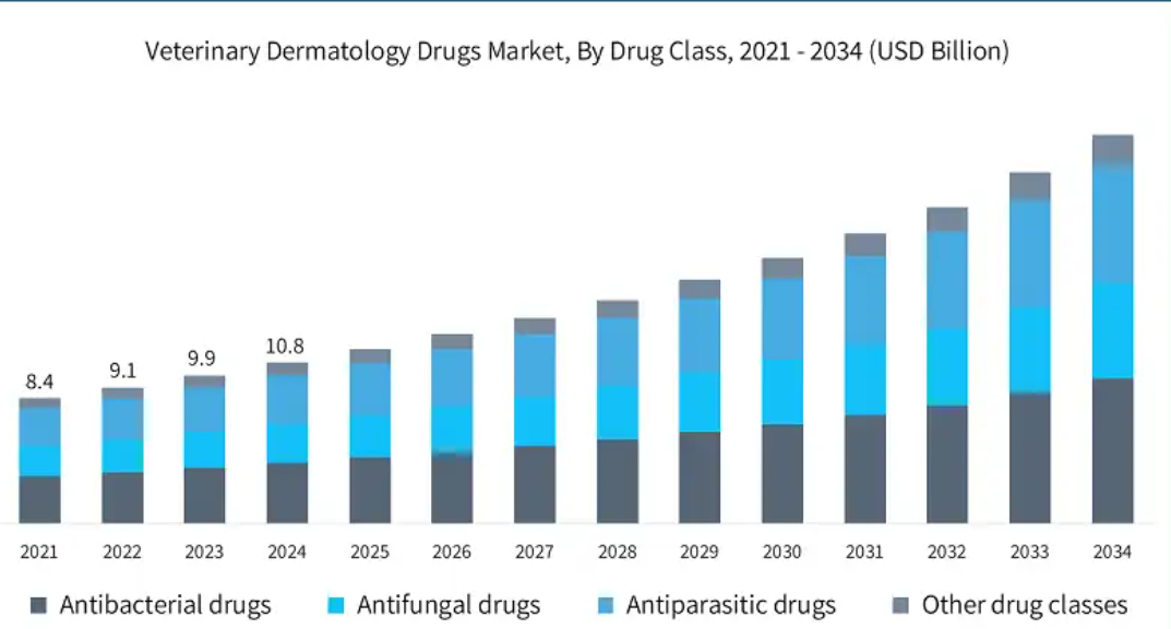 The global veterinary dermatology market is poised for robust growth, with a projected compound annual growth rate (CAGR) of 9.7% from 2025 to 2035, reaching a market value of USD 46.83 billion by 2035 from an estimated USD 18.5 billion in 2024. This growth is driven by increasing pet ownership, rising prevalence of animal skin disorders, advancements in veterinary therapeutics, and growing awareness of animal health. Veterinary dermatology encompasses drugs and treatments for skin conditions like parasitic infections, allergies, and dermatitis in companion and livestock animals.